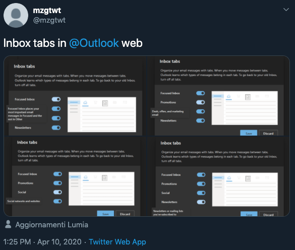 The screenshots are the only thing ever posted by the Twitter account and this was the first I had heard of Microsoft adding tabbed sections to their inbox view, so I took it all with a grain of salt.